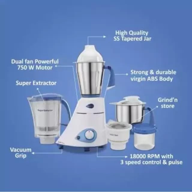 - 4 Jars Included – 1.7L Main Jar, 1.2L Middle Jar, 1.5L Super Extractor Jar (for juicing), and 0.4L Grind n’ Store Jar