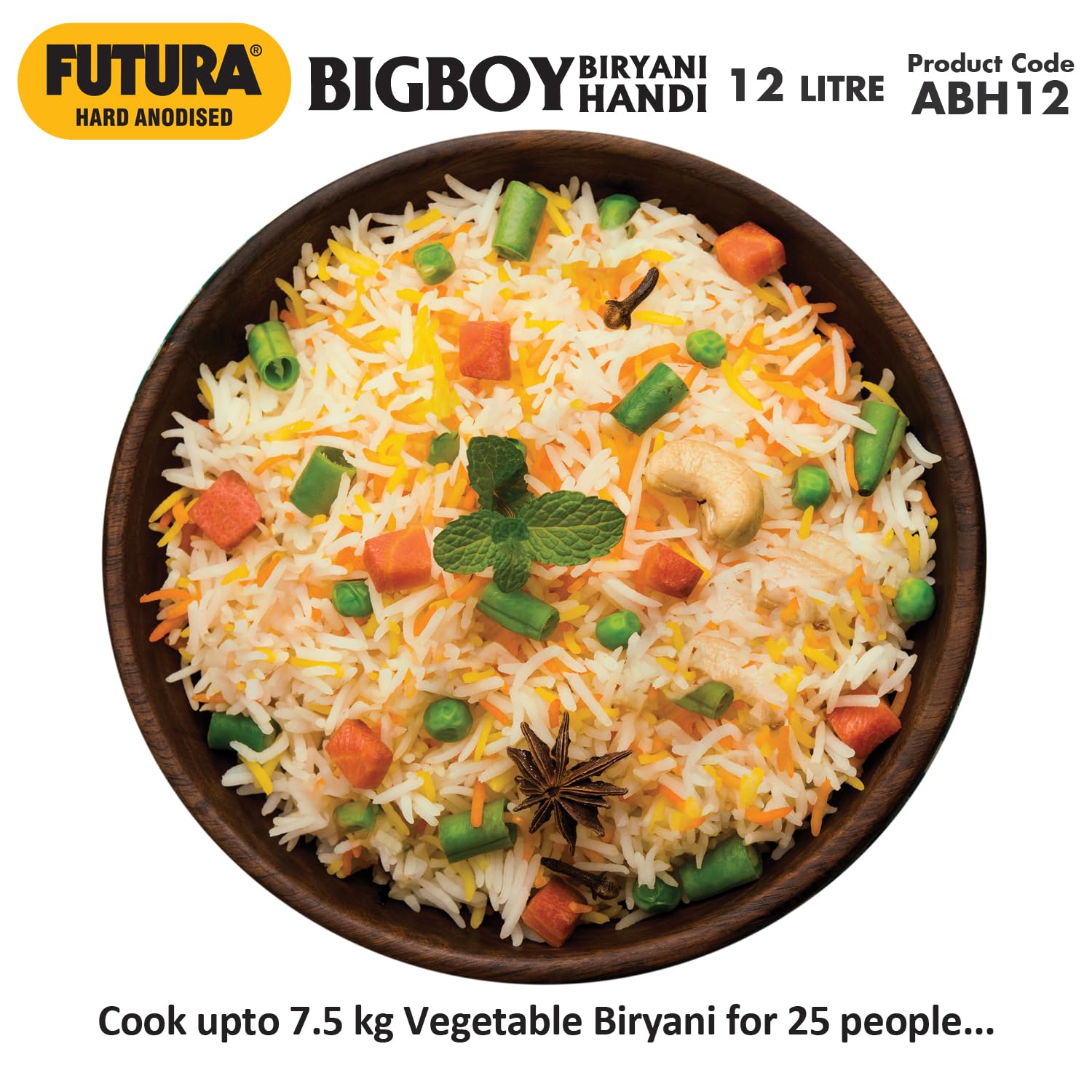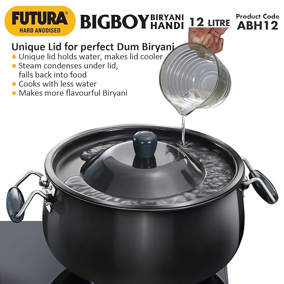 *Unique Lid for Dum Biryani – holds water, makes lid cooler. Steam condenses under lid, falls back into food. Cooks with less water. Makes more flavourful Biryani