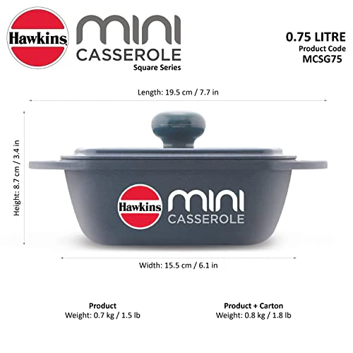 Hawkins 0.75 Litre Mini Casserole with Lid, Square Series Die-Cast pan for Cooking, Reheating, Serving and Storing, Grey (MCSG75)