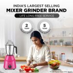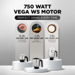 *Powerful 750W Motor – This Powerful 750W motor gives efficient mixing and grinding to your ingredients and saves your expenditure on electricity simultaneously. 215 hours endurance passed motor. Can continuously grind even Urad dal for 30 Mins*.It also grinds hard ingredients like roasted Turmeric in 2 Mins*