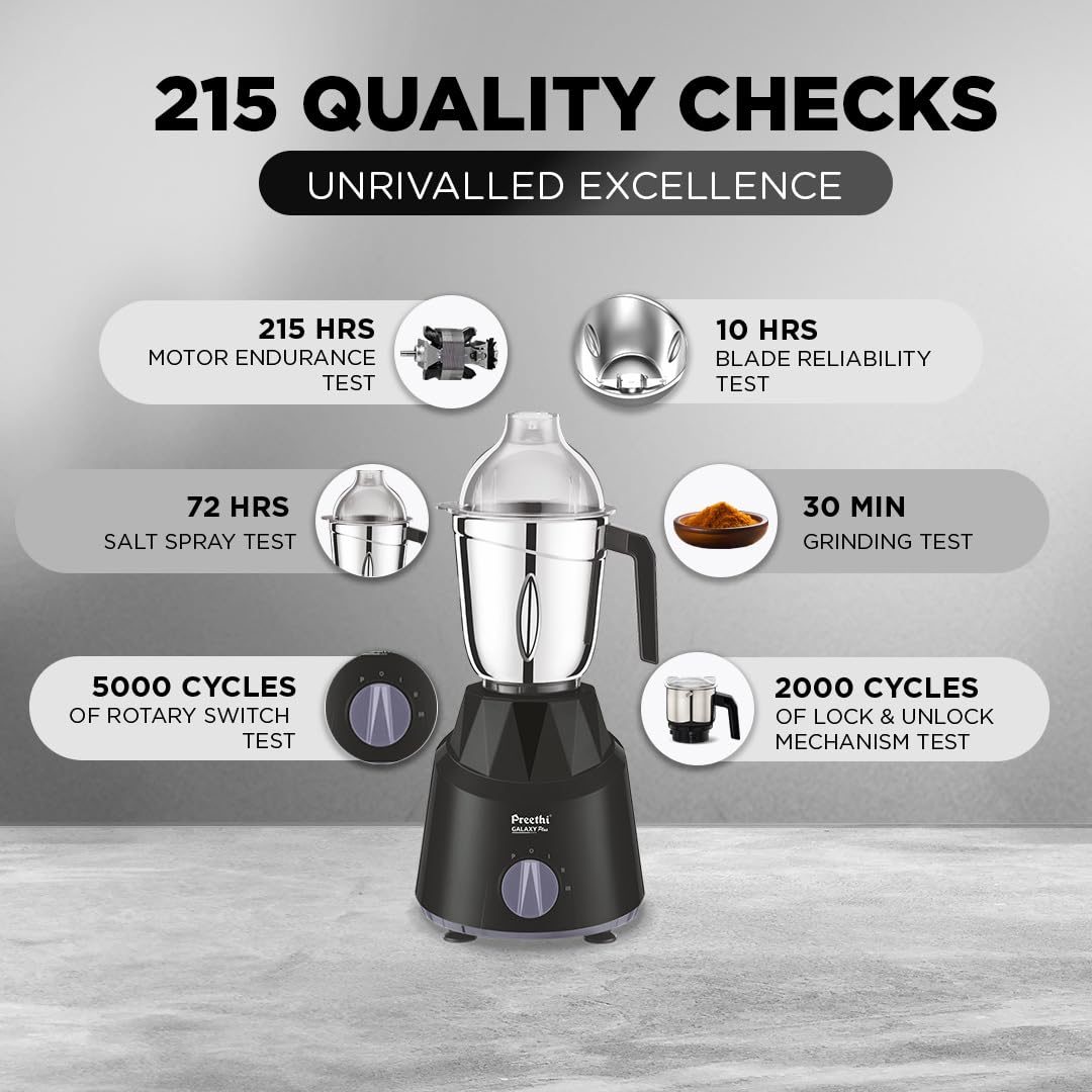 *Performance Features: This Preethi mixer grinder has a powerful motor that ensures robust operations. Powerful 750W Motor – This Powerful 750W motor gives efficient mixing and grinding to your ingredients and saves your expenditure on electricity simultaneously. 215 hours endurance passed motor.