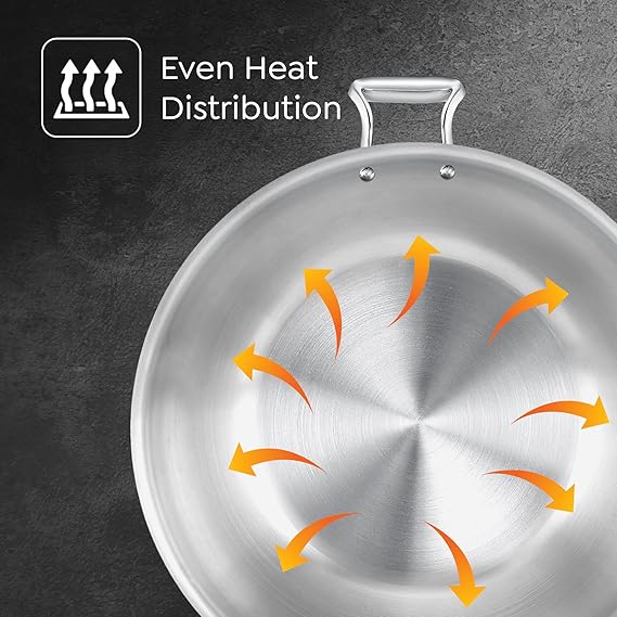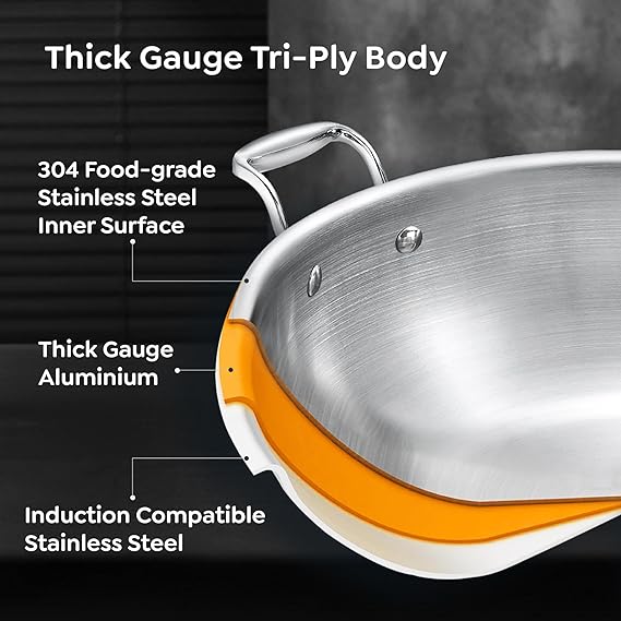 *THICK GAUGE TRI-PLY BODY : 3 layers of metals from base to rim, inner layer is food grade stainless steel, an aluminium core ensures even heating and outer layer is stainless steel