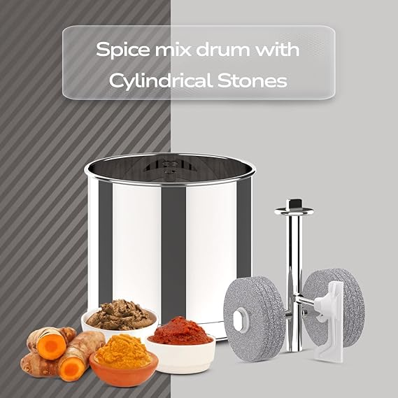 *CELEBRATION PACK – This pack includes a 1 litre SS Spice mix drum with cylindrical stones, SS atta kneader, SS coconut scrapper, along with 2.5 litre multiutility SS drum with conical stones.